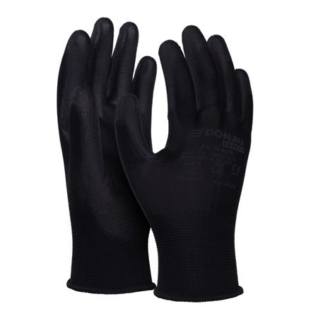 Jó minőségű, fekete poliészter kötött anyagból készült kesztyű, a markolat részén fekete poliuretán bevonattal.